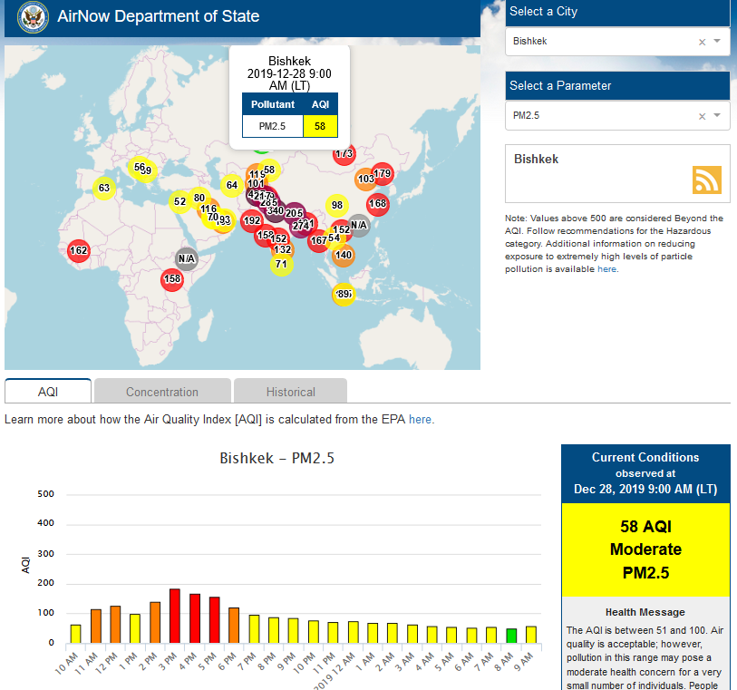 Посольство США в Кыргызстане также установило датчик. Он показывает индекс качества воздуха в режиме онлайн. Информация обновляется ежечасно.
