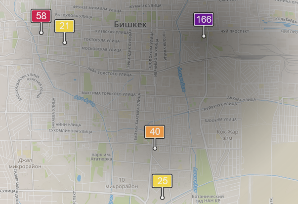 - в районе улиц Бейшеналиевой/Токтогула. Уровень загрязнения превышен в 2,8 раза: PM2.5 среднесуточный — 98 мкг/м³, на момент измерения — 58 мкг/м³;