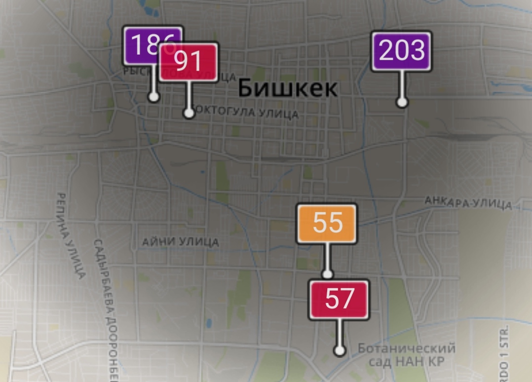 - в районе улиц Бейшеналиевой/Токтогула. Уровень загрязнения превышен в 2,91 раза: PM2.5 среднесуточный — 102 мкг/м³, на момент измерения — 186 мкг/м³;