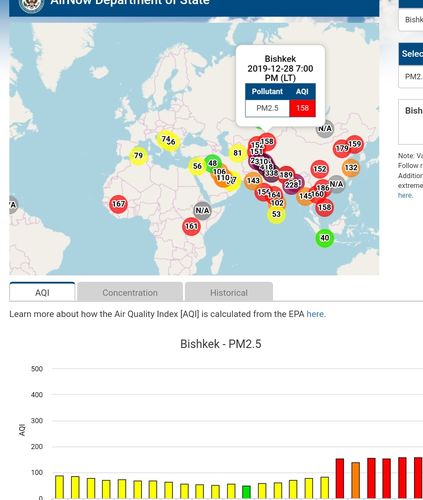 Посольство США в Кыргызстане также установило датчик. Он показывает индекс качества воздуха в режиме онлайн. Информация обновляется ежечасно.
