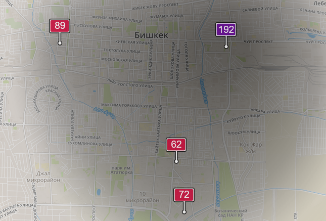 - в районе улиц Бейшеналиевой/Токтогула. Уровень загрязнения превышен в 2,6 раза: PM2.5 среднесуточный — 91 мкг/м³, на момент измерения — 89 мкг/м³;