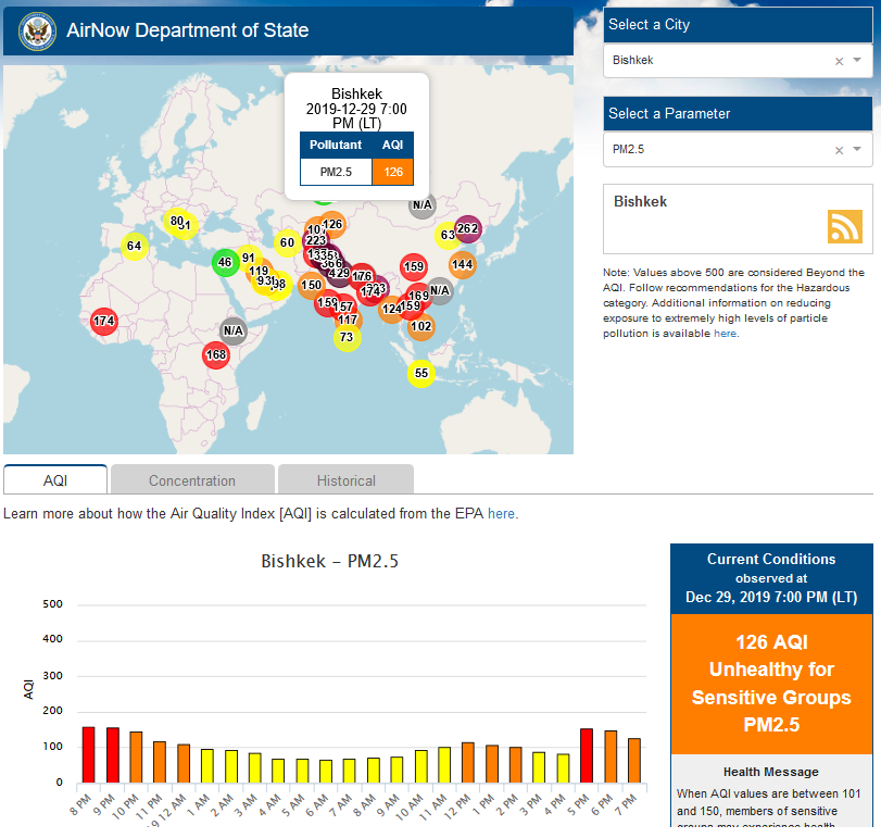 Посольство США в Кыргызстане также установило датчик. Он показывает индекс качества воздуха в режиме онлайн. Информация обновляется ежечасно.