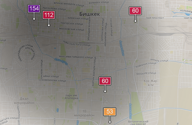 - в районе улиц Бейшеналиевой/Токтогула. Уровень загрязнения превышен в 3,7 раза: PM2.5 среднесуточный — 130 мкг/м³, на момент измерения — 154 мкг/м³;