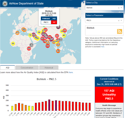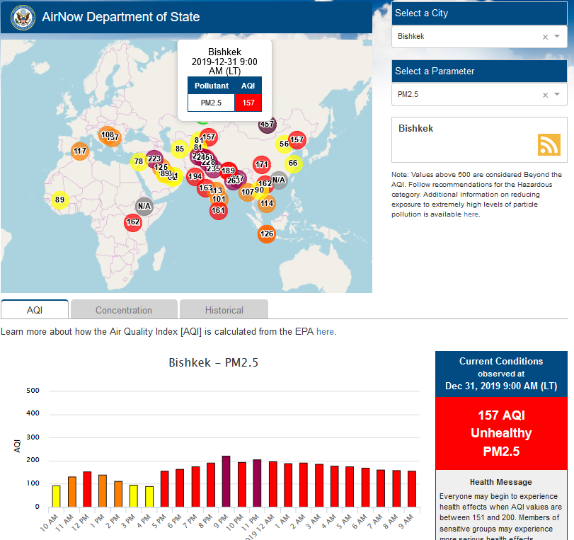 Посольство США в Кыргызстане также установило датчик. Он показывает индекс качества воздуха в режиме онлайн. Информация обновляется ежечасно.