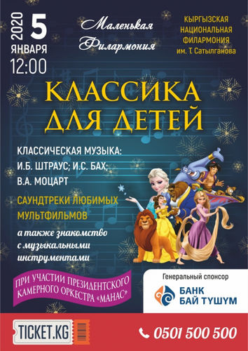 Зто концерт-знакомство с классической музыкой для детей (3+). В программе рекомендуемые произведения известных композиторов, любимые мелодии из мультфильмов в исполнении Президенского камерного оркестра «Манас».