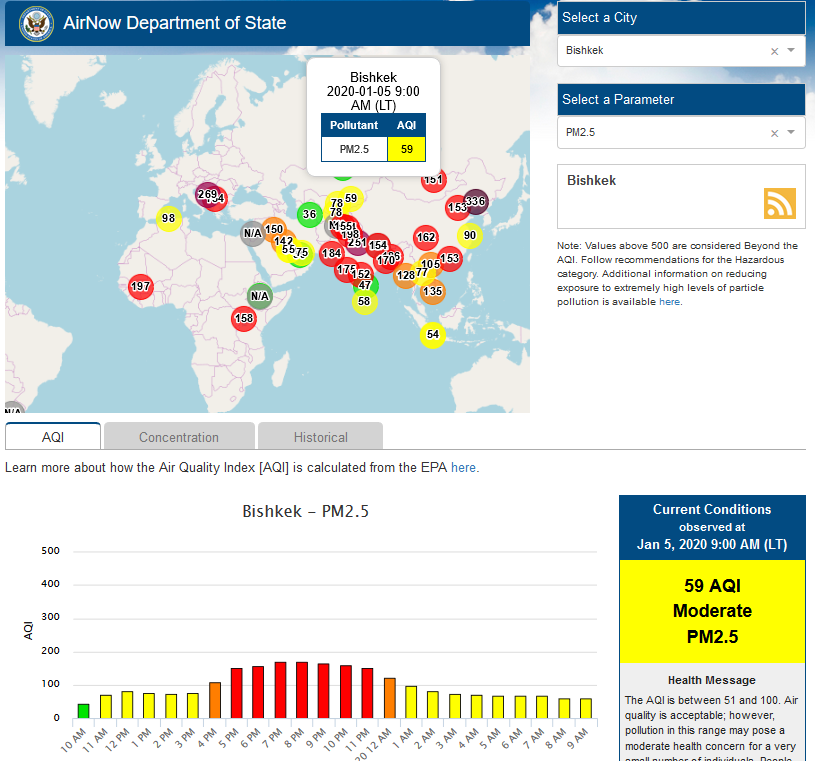 Посольство США в Кыргызстане также установило датчик. Он показывает индекс качества воздуха в режиме онлайн. Информация обновляется ежечасно.