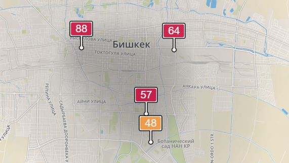 - в районе улиц Бейшеналиевой/Токтогула. Уровень загрязнения превышен в 3,31 раза: PM2.5 среднесуточный — 116 мкг/м³, на момент измерения — 88 мкг/м³;