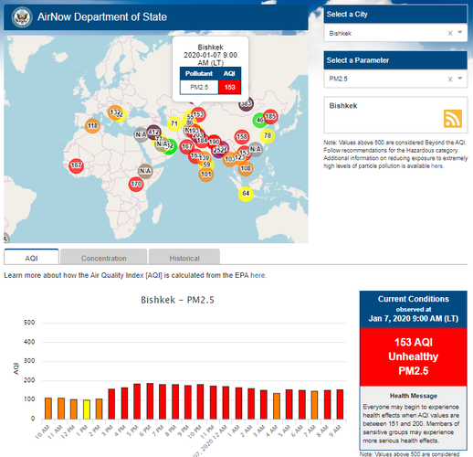 Посольство США в Кыргызстане также установило датчик. Он показывает индекс качества воздуха в режиме онлайн. Информация обновляется ежечасно.