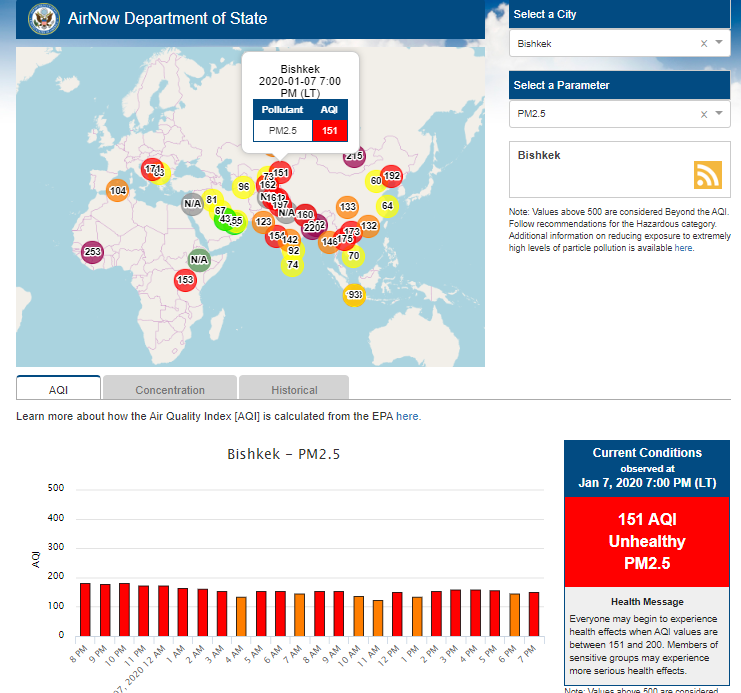 Посольство США в Кыргызстане также установило датчик. Он показывает индекс качества воздуха в режиме онлайн. Информация обновляется ежечасно.