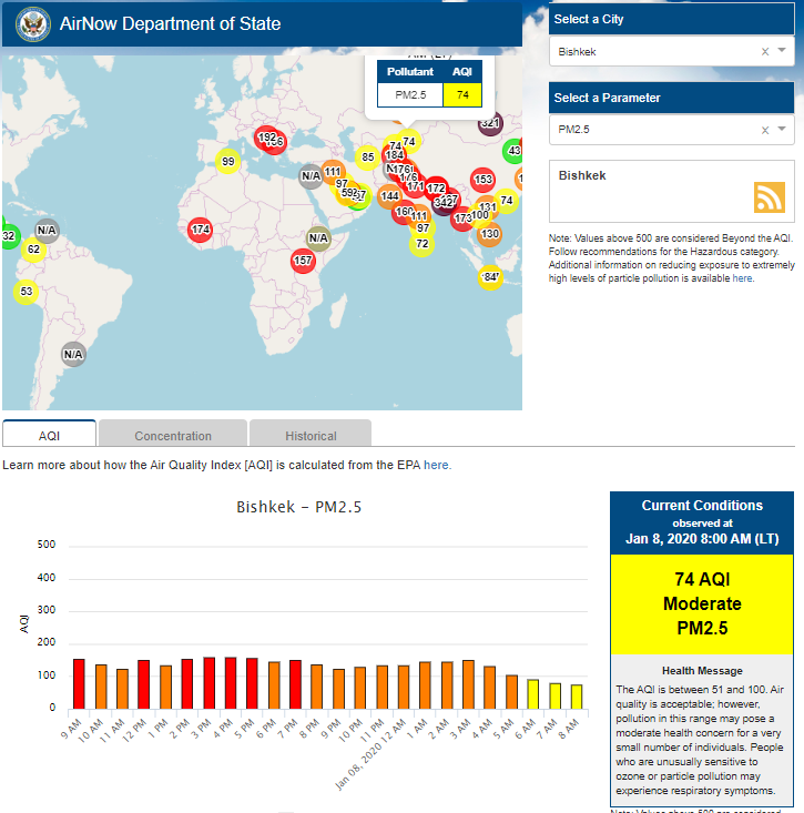 Посольство США в Кыргызстане также установило датчик. Он показывает индекс качества воздуха в режиме онлайн. Информация обновляется ежечасно.