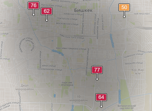 - в районе улиц Бейшеналиевой/Токтогула. Уровень загрязнения превышен в 1,97 раза: PM2.5 среднесуточный — 69 мкг/м³, на момент измерения — 76 мкг/м³;