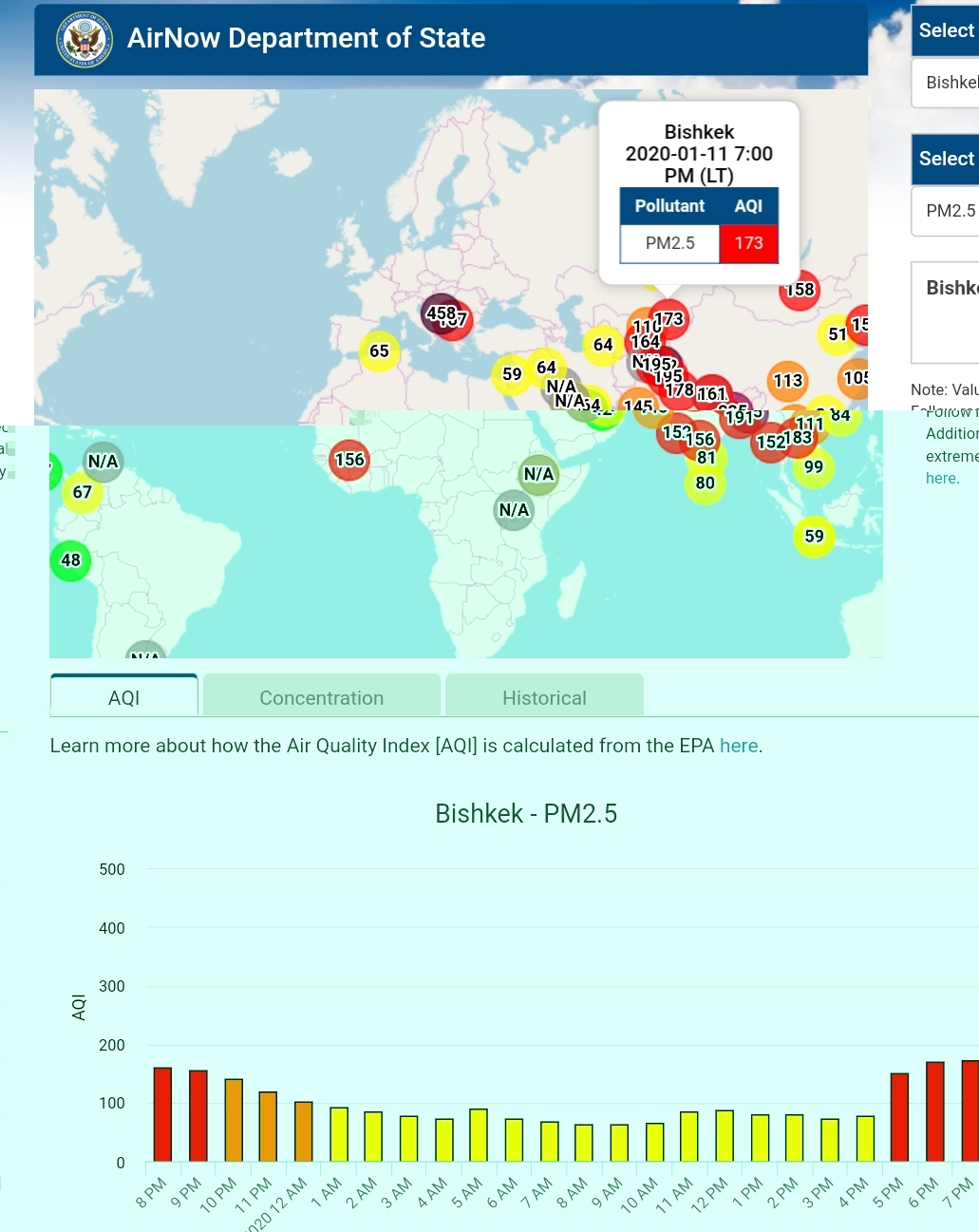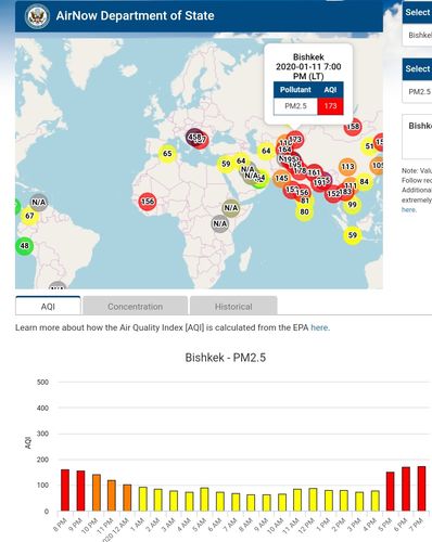 Посольство США в Кыргызстане также установило датчик. Он показывает индекс качества воздуха в режиме онлайн. Информация обновляется ежечасно.