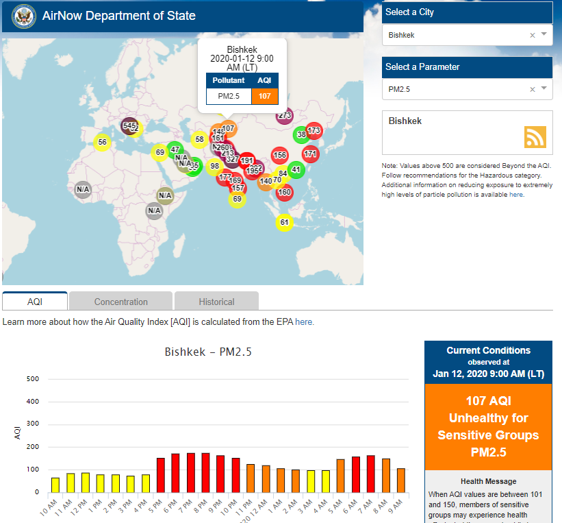 Посольство США в Кыргызстане также установило датчик. Он показывает индекс качества воздуха в режиме онлайн. Информация обновляется ежечасно.