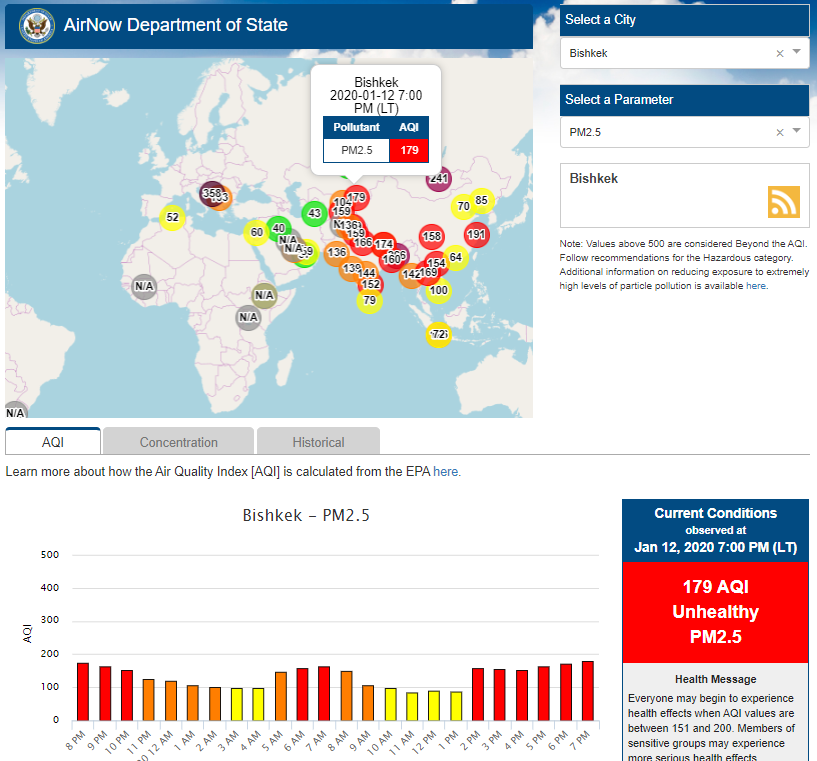 Посольство США в Кыргызстане также установило датчик. Он показывает индекс качества воздуха в режиме онлайн. Информация обновляется ежечасно.