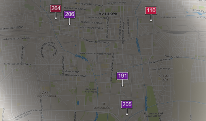 - в районе улиц Бейшеналиевой/Токтогула. Уровень загрязнения превышен в 3,54 раза: PM2.5 среднесуточный — 124 мкг/м³, на момент измерения — 264 мкг/м³;