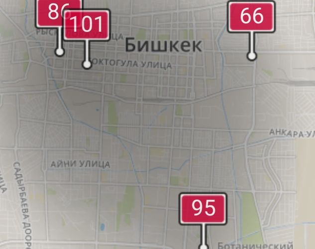 - в районе улиц Бейшеналиевой/Токтогула. Уровень загрязнения превышен в 3,11 раза: PM2.5 среднесуточный — 109 мкг/м³, на момент измерения — 86 мкг/м³;