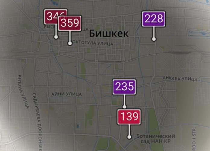 - в районе улиц Бейшеналиевой/Токтогула. Уровень загрязнения превышен в 3,34 раза: PM2.5 среднесуточный — 117 мкг/м³, на момент измерения — 346 мкг/м³;