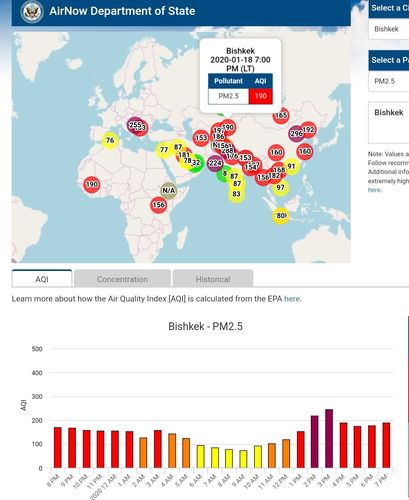 Посольство США в Кыргызстане также установило датчик. Он показывает индекс качества воздуха в режиме онлайн. Информация обновляется ежечасно.