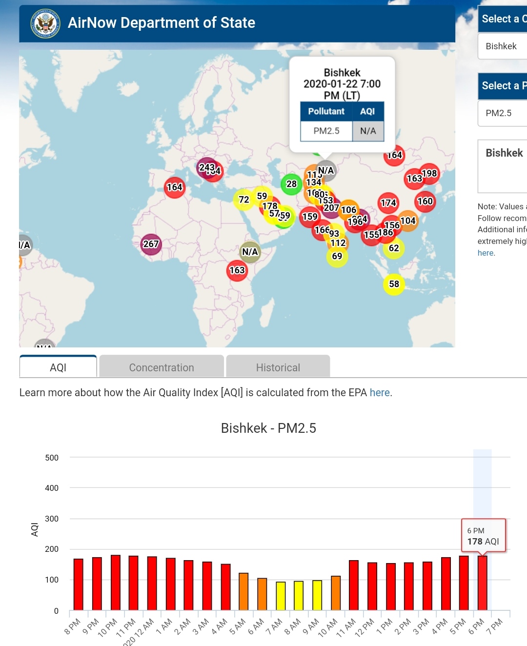 Посольство США в Кыргызстане также установило датчик. Он показывает индекс качества воздуха в режиме онлайн. Информация обновляется ежечасно.