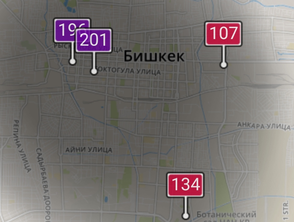 - в районе улиц Бейшеналиевой/Токтогула. Уровень загрязнения превышен в 4,34 раза: PM2.5 среднесуточный — 152 мкг/м³, на момент измерения — 196 мкг/м³;