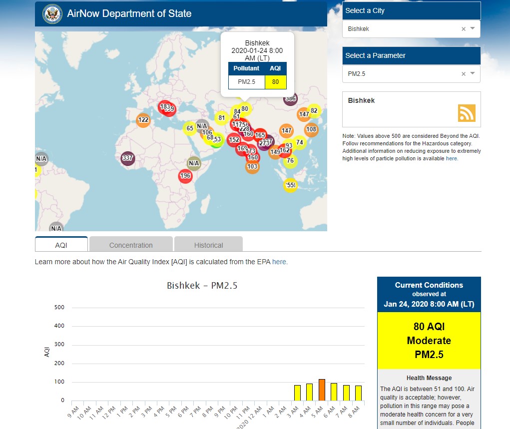 Посольство США в Кыргызстане также установило датчик. Он показывает индекс качества воздуха в режиме онлайн. Информация обновляется ежечасно.