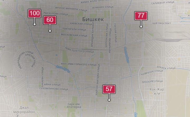 - в районе улиц Бейшеналиевой/Токтогула. Уровень загрязнения превышен в 3,31 раза: PM2.5 среднесуточный — 116 мкг/м³, на момент измерения — 100 мкг/м³;