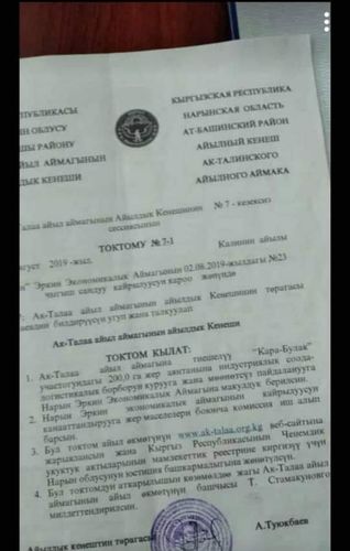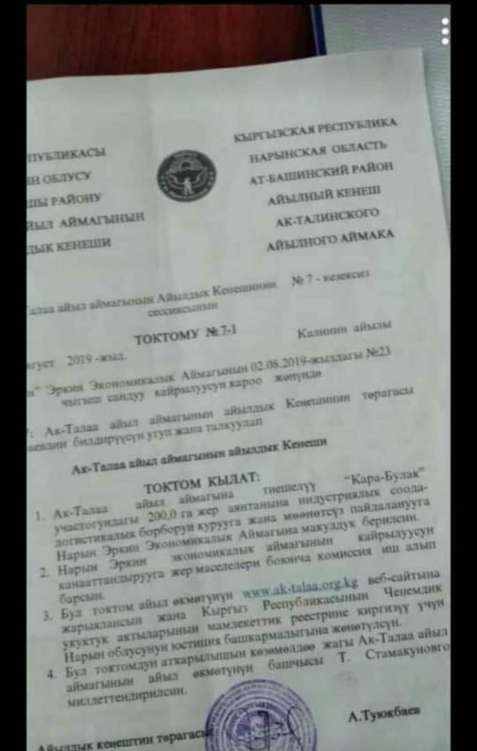 Отметим, что в интернете опубликовали постановление местного кенеша о выделении 200 гектаров земли в СЭЗ «Нарын» села Ак-Талаа Ат-Башинского района. В документе говорится, что землю СЭЗ получит на неопределенный срок. Пользователи соцсетей подняли шум, что землю передают в собственность китайским инвесторам для строительства логистического центра.