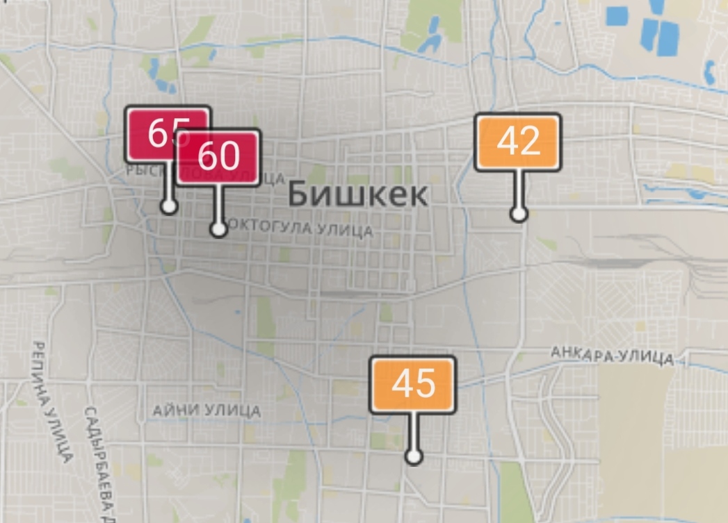 - в районе улиц Бейшеналиевой/Токтогула. Уровень загрязнения превышен в 2,51 раза: PM2.5 среднесуточный — 88 мкг/м³, на момент измерения — 65 мкг/м³;