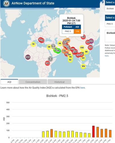 Посольство США в Кыргызстане также установило датчик. Он показывает индекс качества воздуха в режиме онлайн. Информация обновляется ежечасно.