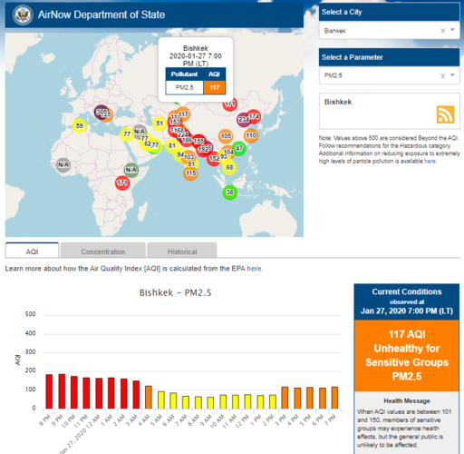 Посольство США в Кыргызстане также установило датчик. Он показывает индекс качества воздуха в режиме онлайн. Информация обновляется ежечасно.