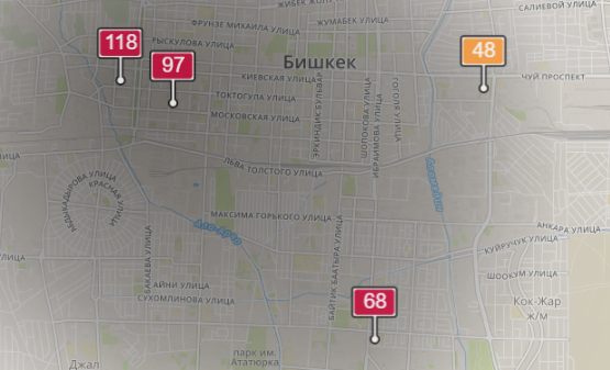 - в районе улиц Бейшеналиевой/Токтогула. Уровень загрязнения превышен в 2,85 раза: PM2.5 среднесуточный — 100 мкг/м³, на момент измерения — 118 мкг/м³;
