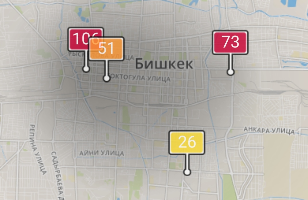 - в районе улиц Бейшеналиевой/Токтогула. Уровень загрязнения превышен в 3,03 раза: PM2.5 среднесуточный — 106 мкг/м³, на момент измерения — 86 мкг/м³;