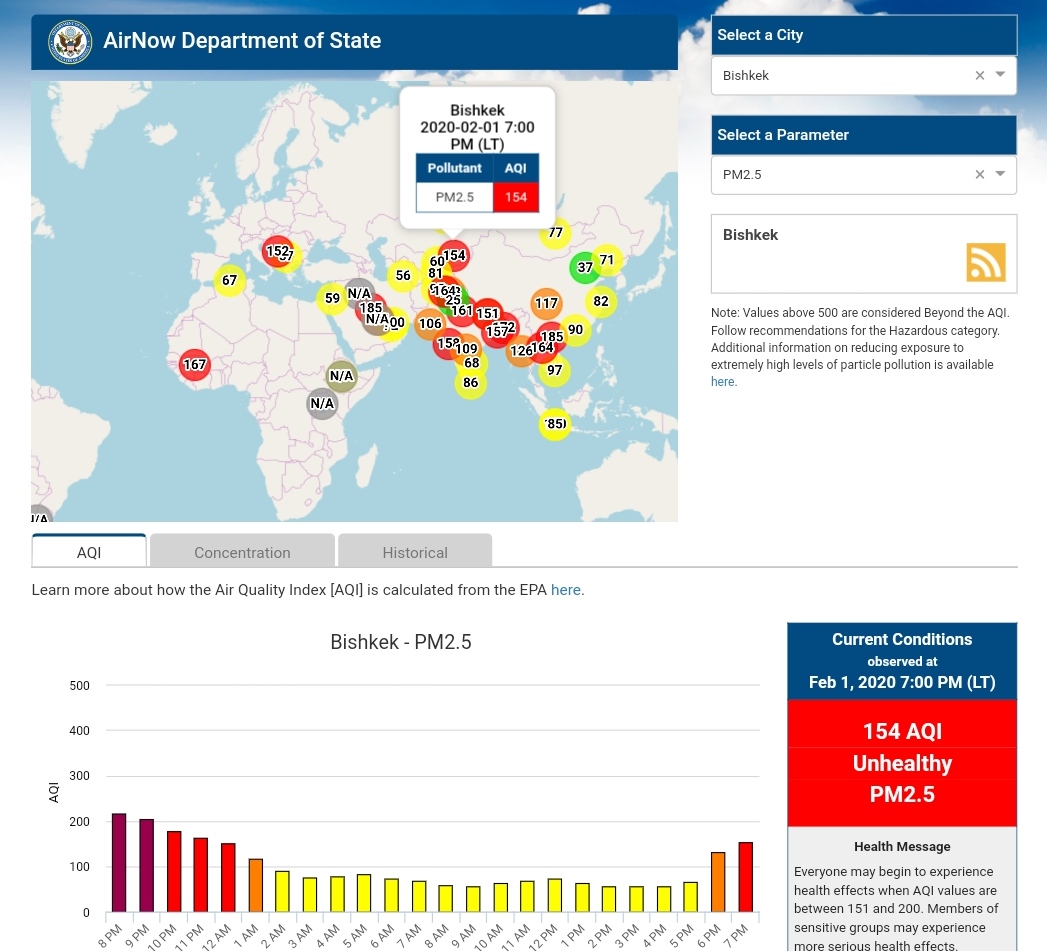 Посольство США в Кыргызстане также установило датчик. Он показывает индекс качества воздуха в режиме онлайн. Информация обновляется ежечасно.