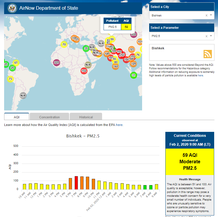 Посольство США в Кыргызстане также установило датчик. Он показывает индекс качества воздуха в режиме онлайн. Информация обновляется ежечасно.