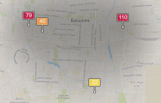 - в районе улиц Бейшеналиевой/Токтогула. Уровень загрязнения превышен в 1,54 раза: PM2.5 среднесуточный — 54 мкг/м³, на момент измерения — 79 мкг/м³;