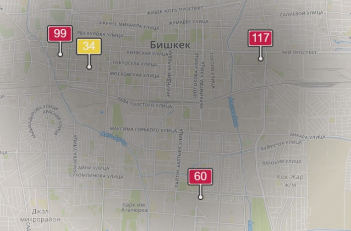 - в районе улиц Бейшеналиевой/Токтогула. Уровень загрязнения превышен в 1,63 раза: PM2.5 среднесуточный — 57 мкг/м³, на момент измерения — 99 мкг/м³;