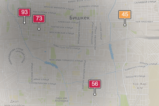 - в районе улиц Бейшеналиевой/Токтогула. Уровень загрязнения превышен в 1,31 раза: PM2.5 среднесуточный — 46 мкг/м³, на момент измерения — 93 мкг/м³;