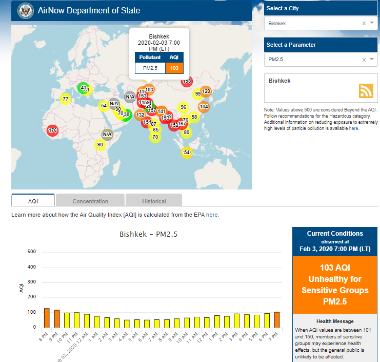 Посольство США в Кыргызстане также установило датчик. Он показывает индекс качества воздуха в режиме онлайн. Информация обновляется ежечасно.