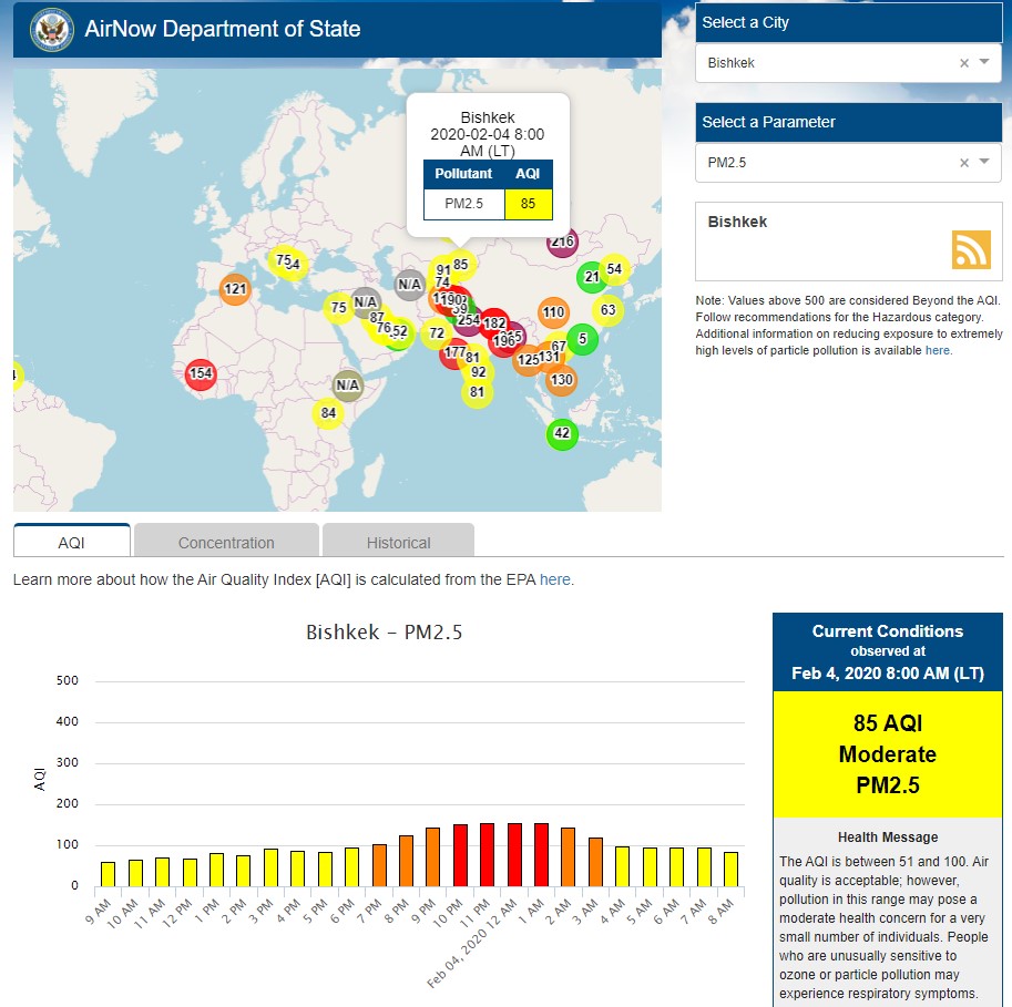 Посольство США в Кыргызстане также установило датчик. Он показывает индекс качества воздуха в режиме онлайн. Информация обновляется ежечасно.