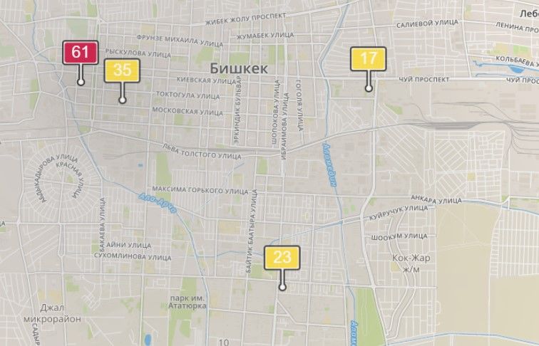- в районе улиц Бейшеналиевой/Токтогула. Уровень загрязнения превышен в 2,34 раза: PM2.5 среднесуточный — 82 мкг/м³, на момент измерения — 61 мкг/м³;