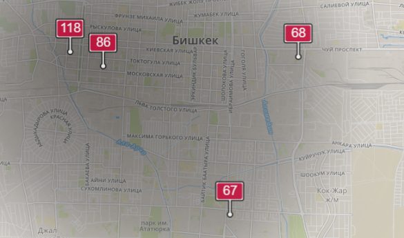 - в районе улиц Бейшеналиевой/Токтогула. Уровень загрязнения превышен в 2,37 раза: PM2.5 среднесуточный — 83 мкг/м³, на момент измерения — 118 мкг/м³;