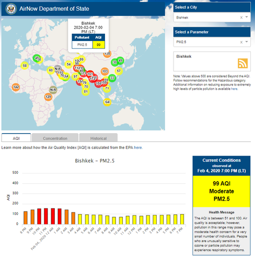 Посольство США в Кыргызстане также установило датчик. Он показывает индекс качества воздуха в режиме онлайн. Информация обновляется ежечасно.