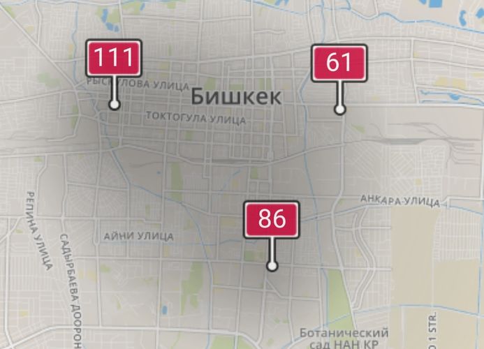 - в районе улиц Бейшеналиевой/Токтогула. Уровень загрязнения превышен в 1,54 раза: PM2.5 среднесуточный — 54 мкг/м³, на момент измерения — 111 мкг/м³;