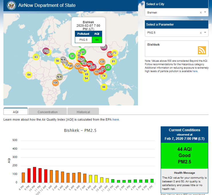 Посольство США в Кыргызстане также установило датчик. Он показывает индекс качества воздуха в режиме онлайн. Информация обновляется ежечасно.