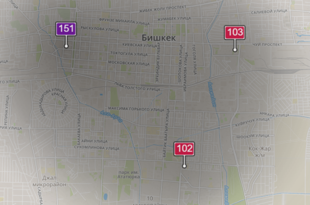 - в районе улиц Бейшеналиевой/Токтогула. Уровень загрязнения превышен в 4,4 раза: PM2.5 среднесуточный — 154 мкг/м³, на момент измерения — 151 мкг/м³;