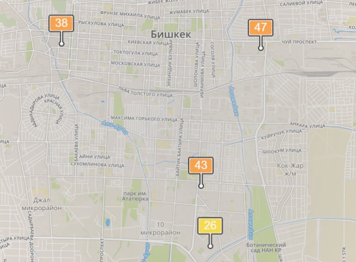 - в районе улиц Бейшеналиевой/Токтогула. Уровень загрязнения превышен в 1,29 раза: PM2.5 среднесуточный — 45 мкг/м³, на момент измерения — 38 мкг/м³;