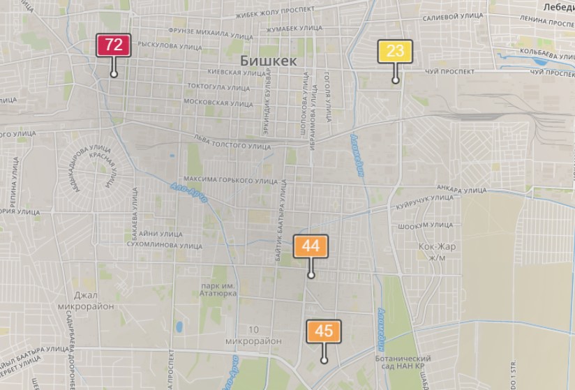 - в районе улиц Бейшеналиевой/Токтогула. Уровень загрязнения не превышен: PM2.5 среднесуточный — 33 мкг/м³, на момент измерения — 72 мкг/м³;