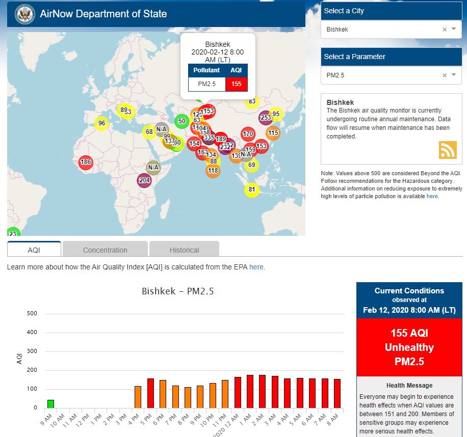 Посольство США в Кыргызстане также установило датчик. Он показывает индекс качества воздуха в режиме онлайн. Информация обновляется ежечасно.