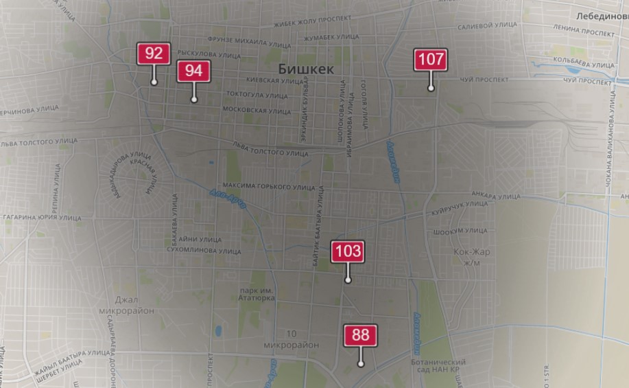 - в районе улиц Бейшеналиевой/Токтогула. Уровень загрязнения превышен в 2,83 раза: PM2.5 среднесуточный — 99 мкг/м³, на момент измерения — 92 мкг/м³;