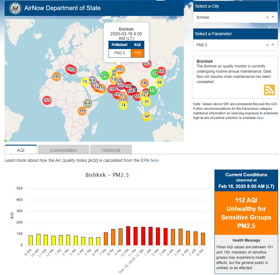 Посольство США в Кыргызстане также установило датчик. Он показывает индекс качества воздуха в режиме онлайн. Информация обновляется ежечасно.